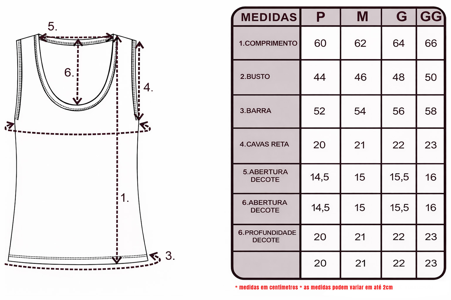 Caso tenha dúvidas sobre tamanho, modelagem ou qualquer outra informação sobre a peça, entre em contato com nosso atendimento. Será um prazer ajudar você a escolher sua próxima regata favorita 💖