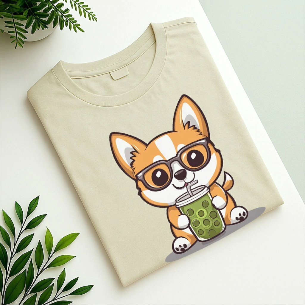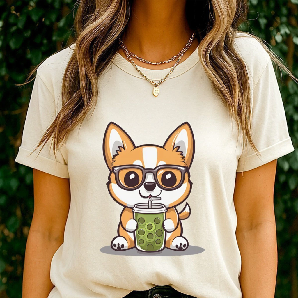 algodao premium Bubble Tea Casual Style Corgi Estampa Animal estampa exclusiva integrar Moda Divertida T-shirt feminina